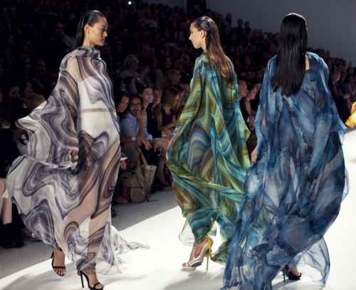 Brazilian designer Carlos Miele was a standout show at Mercedes Benz Fashion Week. Beginning with a rhythmic drum beat, Miele’s collection entitled Immersive Landscapes pounded onto to the stage, as four models draped in flowing silk chiffon kaftans walked in succession in tangerine, lime, smoke and aqua. After that powerful opening, Miele made his landscape clear, as virtual and natural environments came together in a tone of eye popping colours and liquefied prints. Brilliant deep coral crepe plunging jump suits with thick bronze belts made an impact, as did Ivanka Trump’s jewelry, which consisted of back- to- front necklaces, that hung down the backs of the model’s low slung gowns. There was also plenty of one shoulder numbers, with sky high splits and wrap skirts that were so sexy yet simple in their execution. Sheer plunging shirts were also a signal to bringing sexy back to summer – with fiery goldfish print silk satin skirts and gold metallic wide leather belts. With hair slicked back off faces, the startling bling of a gold metal mesh asymmetric top is juxtaposed against the crisp white of a long crepe skirt, to balance the fire with ice. Plus, there was a vivid turquoise long silk charmeuse gown, with petite pleats and a delicate cut that exposed the shoulders, chest and legs, whilst still conveying elegance and an otherworldly appeal. Dresses looked like they were literally on fire or as white hot as the core of the sun itself, but were still as graceful and cascading as the ocean.