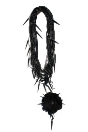 Creator of Fashion Munster, designer, host and all- round fashionista, Isaiah Garza, has launched his debut jewellery line, and it is definitely in a realm all it’s own. Garza’s collection somehow transcends mere jewellery, as each piece is creatively crafted from passion, and not fleeting trends. This is unquestionably Garza’s forte – not being afraid to exhibit emotion, purity and spontaneity. His designs are eye- catching and immediate; their creation was born from a desire to simply craft something that has come directly from Garza’s heart and fervour. Drawing added inspiration from an obsession with the late Alexander McQueen’s Savage Beauty exhibition, Garza explains that some of the images from McQueen’s past work helped to push him over the finishing line. “[McQueen’s] work has always played a role in everything I do, but not by his designs. By the way he pushed himself to be better and to do more. He didn’t pay attention to anything else around him. He designed from his vision and his only. That is basically what I did [with this collection].” These are very personal, hand- made pieces and each piece has acquired an accompanying name that therefore denotes it’s relevance. Using chains, spikes, silk flowers, beads and fake plants, the following are some stand out pieces from this collection, that is anything but conservative.