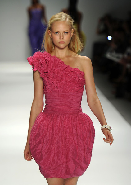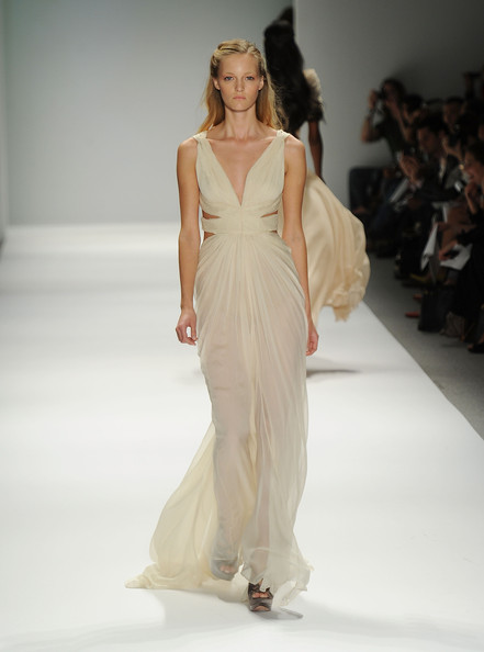 Tadashi began his show with a silk linen tulip shaped ball gown, consisting of hand painted white magnolias against a green swathe of fabric.