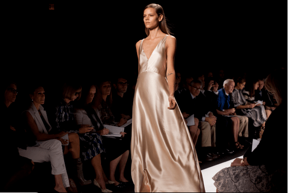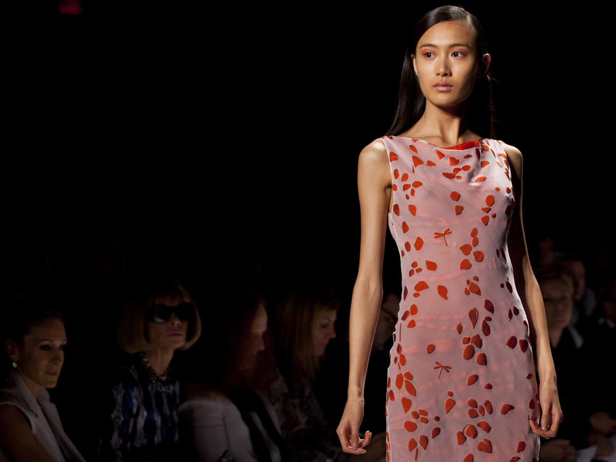 Minimalism was the name of the game at Narciso Rodriguez. Sophisticated draping of flowing silk crepe and chiffon cloque dresses and skirts. Low cut dresses skimmed the models chests, held up by shoelace thin straps, as delicate patterns adorned slip dresses like petals falling from a flower. Ankle length gowns of blush, nude, white and black serenely ambled down the catwalk. Sensible shoes were also exhibited as Rodriguez demonstrated naivety and elegance without the va-va-voom.