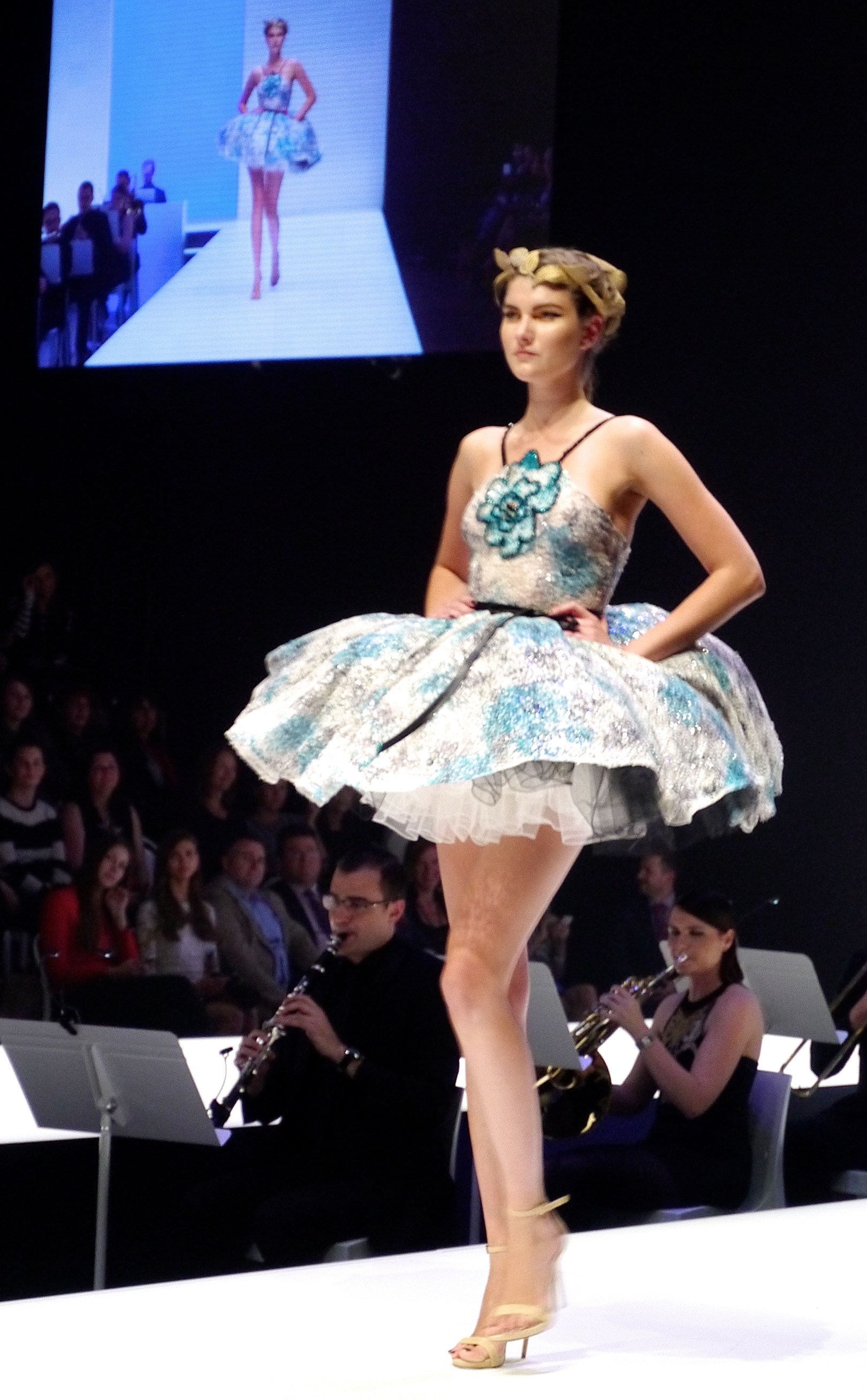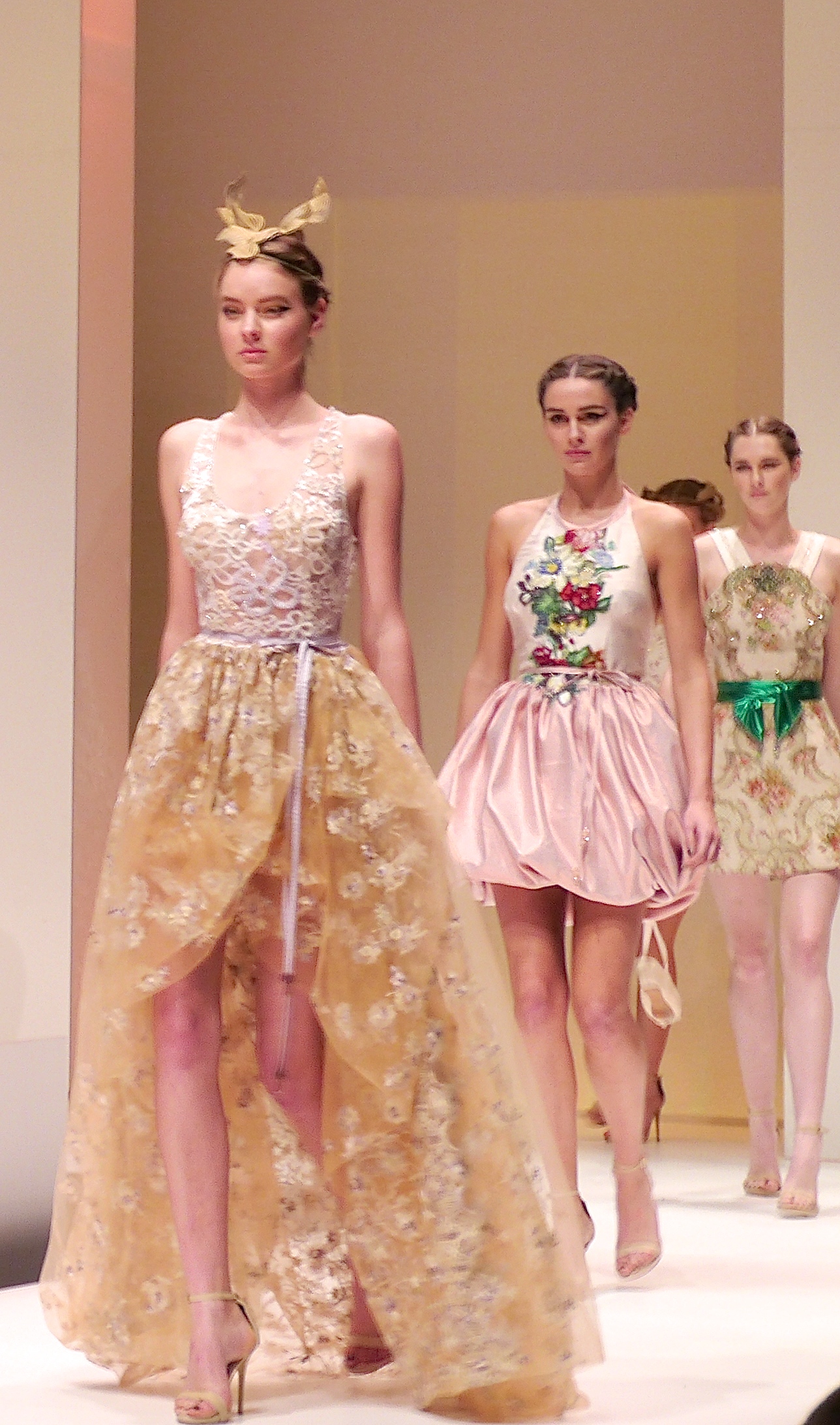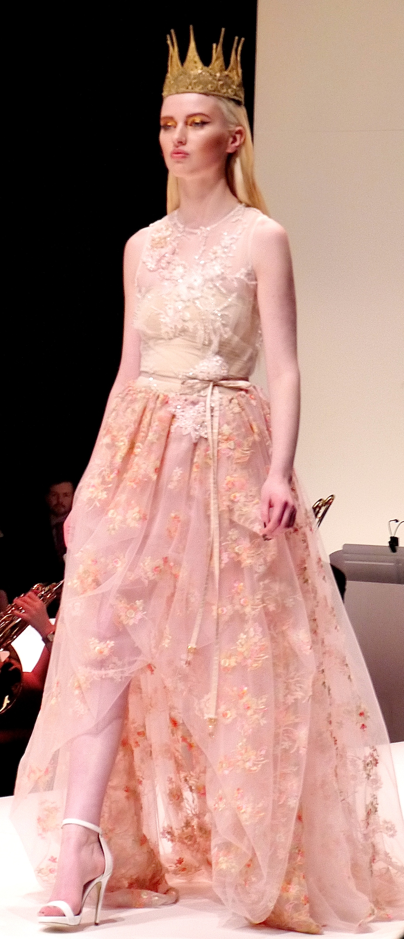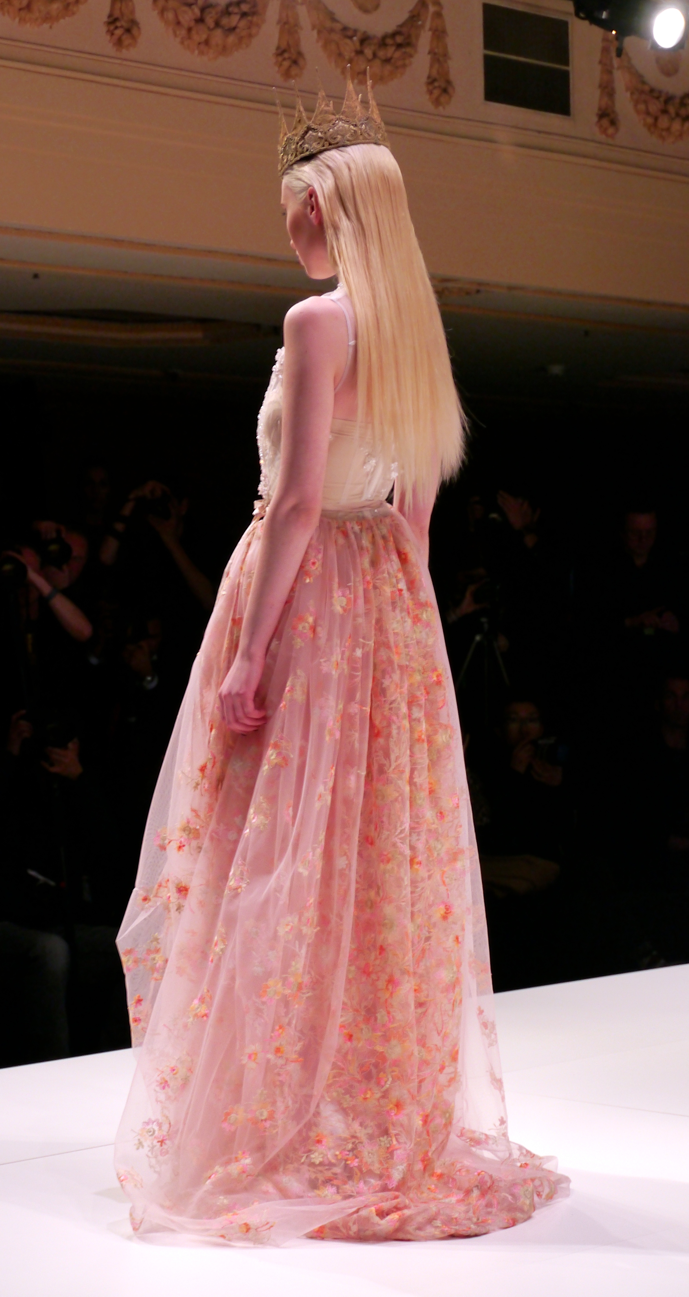 As though it were conjured from the pages of a glittering sassy fairytale, Anaessia’s sugary sweet concoctions floated onto the runway. Yet in the midst of these delicate and frothy designs was housed a slight mystically malefic undertone that was brilliantly fun to witness. The tutu outfits, encrusted with flowers and wrapped in ribbons were ballerina-meets-princess, yet with layers of sexiness (and cheekiness). Nectarous embroidered tulip skirts and sweeping tulle gowns in creamy peaches, dusty pinks, pastel lilacs, bright golds and vibrant turquoise were also on show.