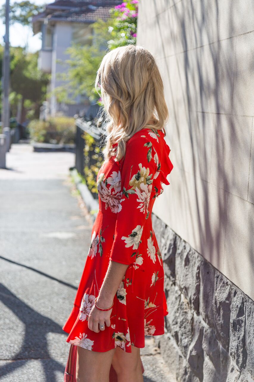Styling her outfit with the bold colours of Summer (however dwindling the season may be, the temperature has shown no signs of wavering), the focal point is a show-stopping ruffled floral tea dress from Topshop‘s latest collection.