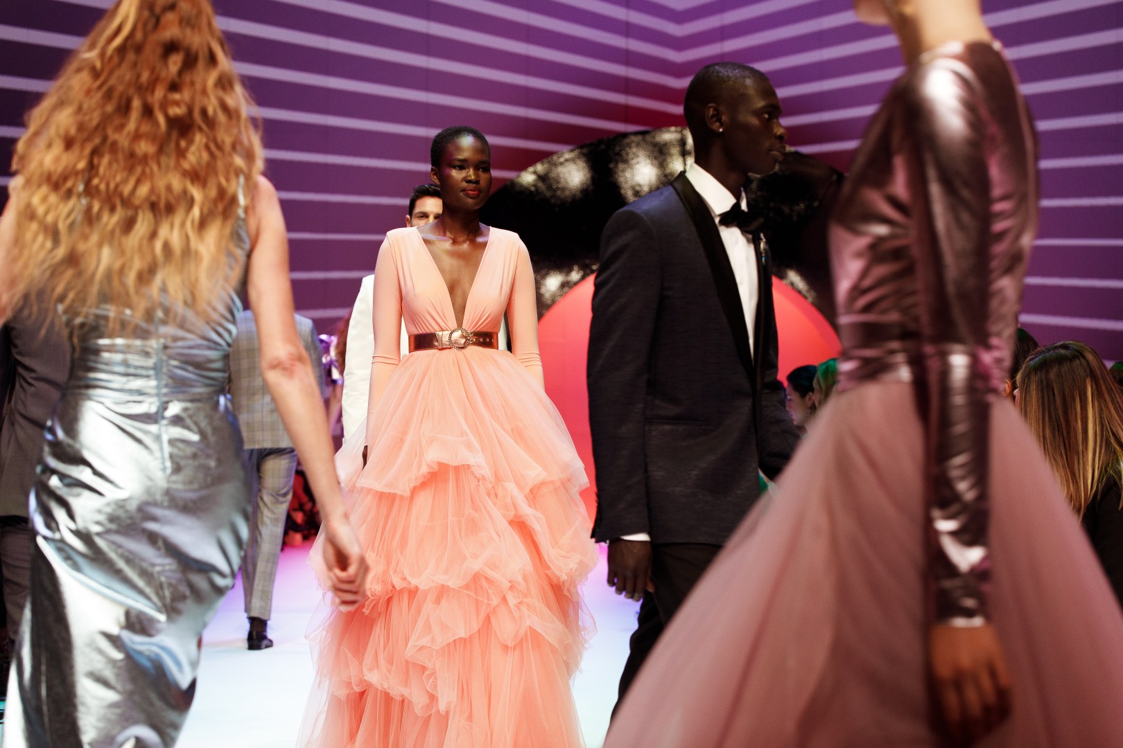 Nicola Finetti, another of our wonderful favourites from over the years, was all about ‘the party’ – with billowing sleeves, popping pastels, gnarly neons with unique hemline and decolletage details that shouted both bold strength and soft femininity in one breath. We loved the playful socks with closed-toe Mary Janes too.