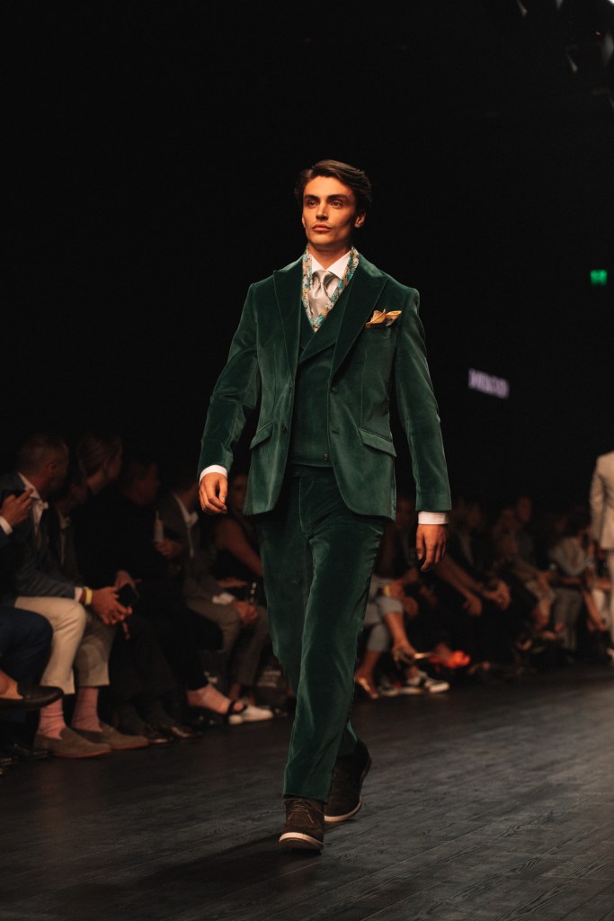 To open, long-time favourite and stalwart of men’s fashion in Australia, Dom Bagnato presented stunning 3-piece suits in hues of dark emerald, rich ochre, light charcoal and deep ivory. Models walked to Stevie Wonder’s ‘Superstition’ in suits tailored to perfection; made from luxurious fabrics such as velvet and wool, with pocket squares, ties and scarves in an array of patterns pulling the sensationally handsome looks together.