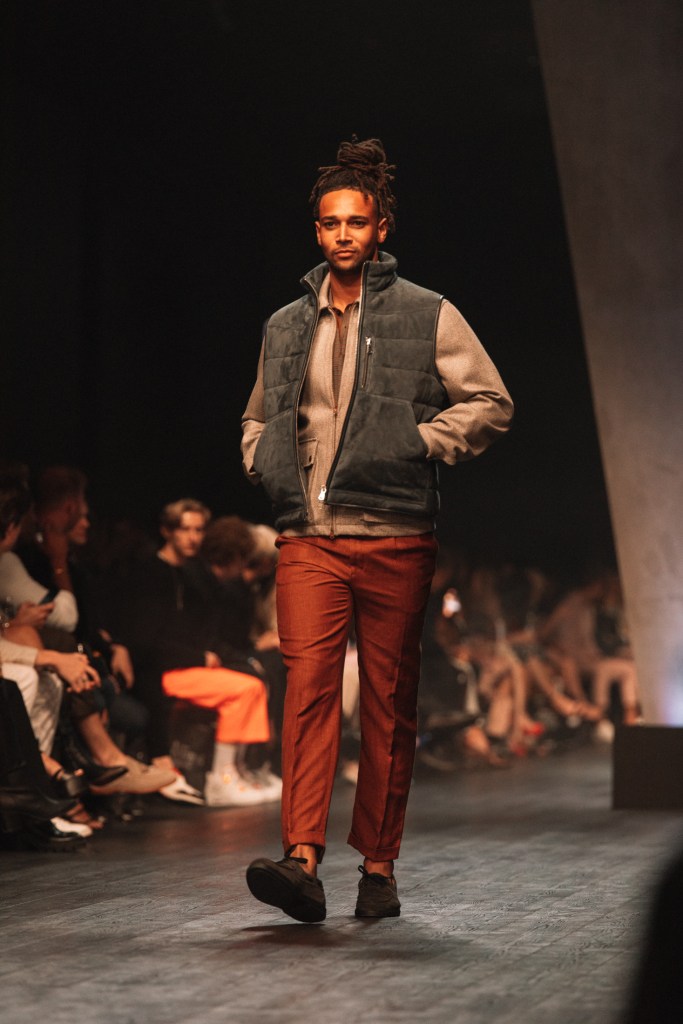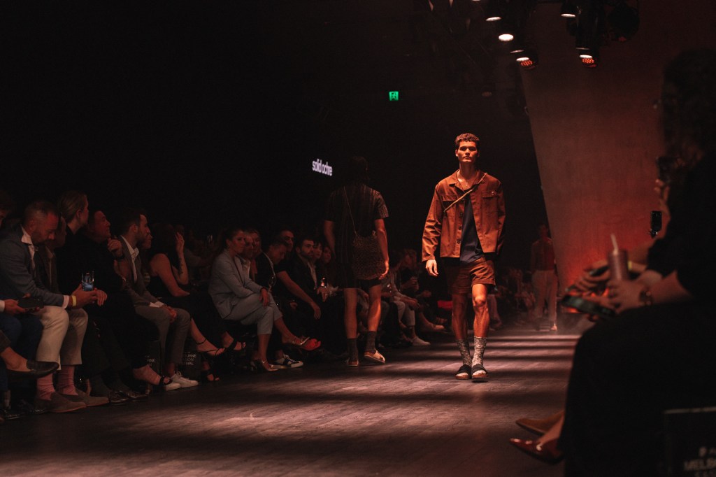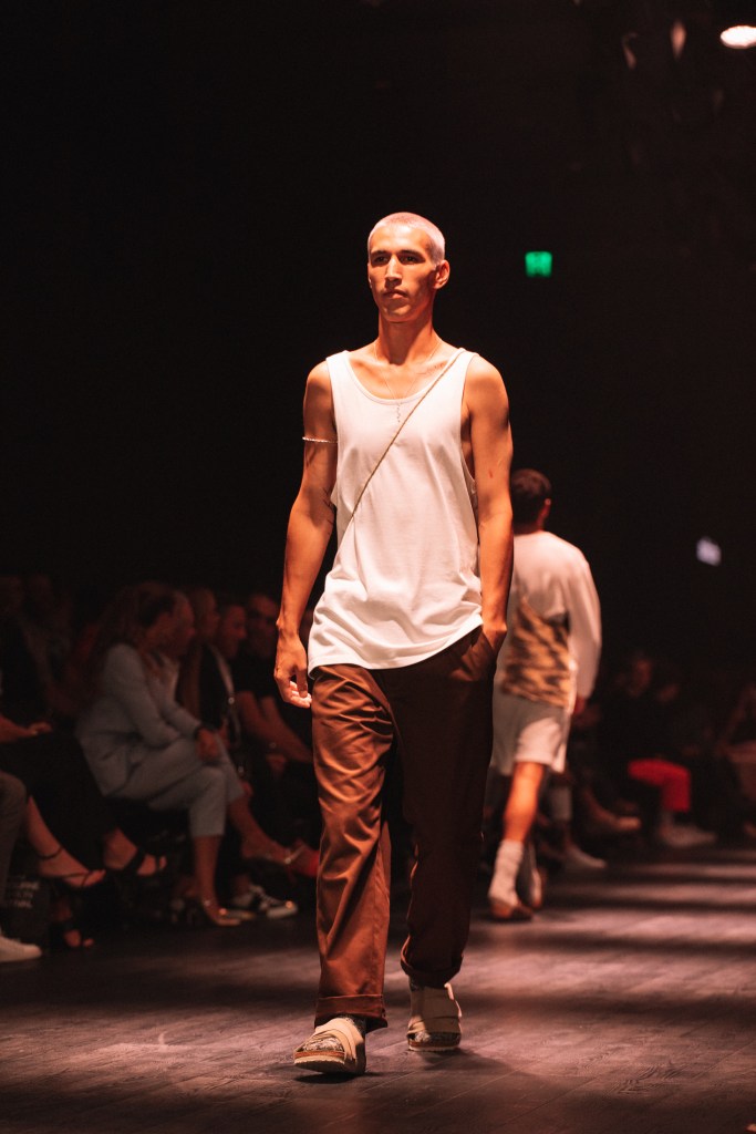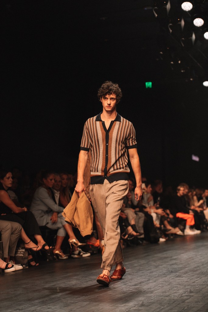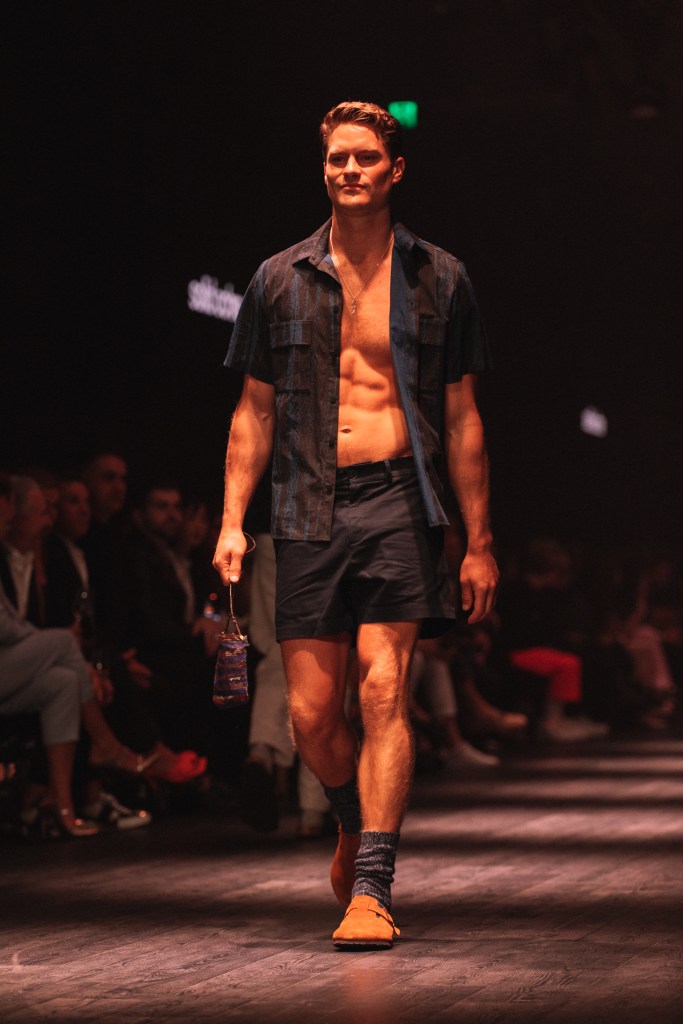 Inspired by culture and connection to Country, Solid Ochre is the fashion label founded and designed by international model, industry leader and First Nations Culture & Safety Consultant for MFF, Nathan McGuire. Featuring an eclectic collection of paired back looks highlighting earthy tones in comfortable cuts. The collection included white linen pants slung low at the hips, shirt and short combos in hues of sienna, charcoal and blue, paired with woollen socks (legit so comfy looking) and suede sandals. Relaxed and stylish, Solid Ochre emanated a refined confidence and understated style that resonated.