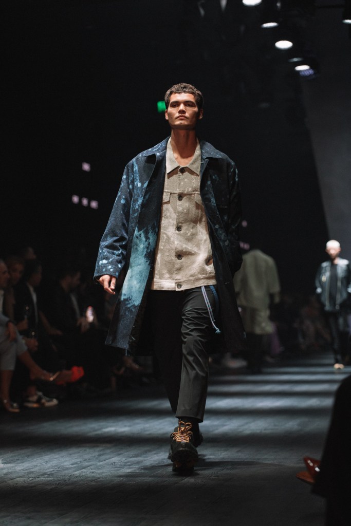 Song For The Mute describes itself as having a ‘male and female cast, with narratives told with beautiful fabrics and experimental process’. Their collection exhibited light and dark, colour and achromatic – an edgy streetwear feel that popped with diamond-patterned jackets, faux leather pants, warped check patterns and embellished splatter coats.