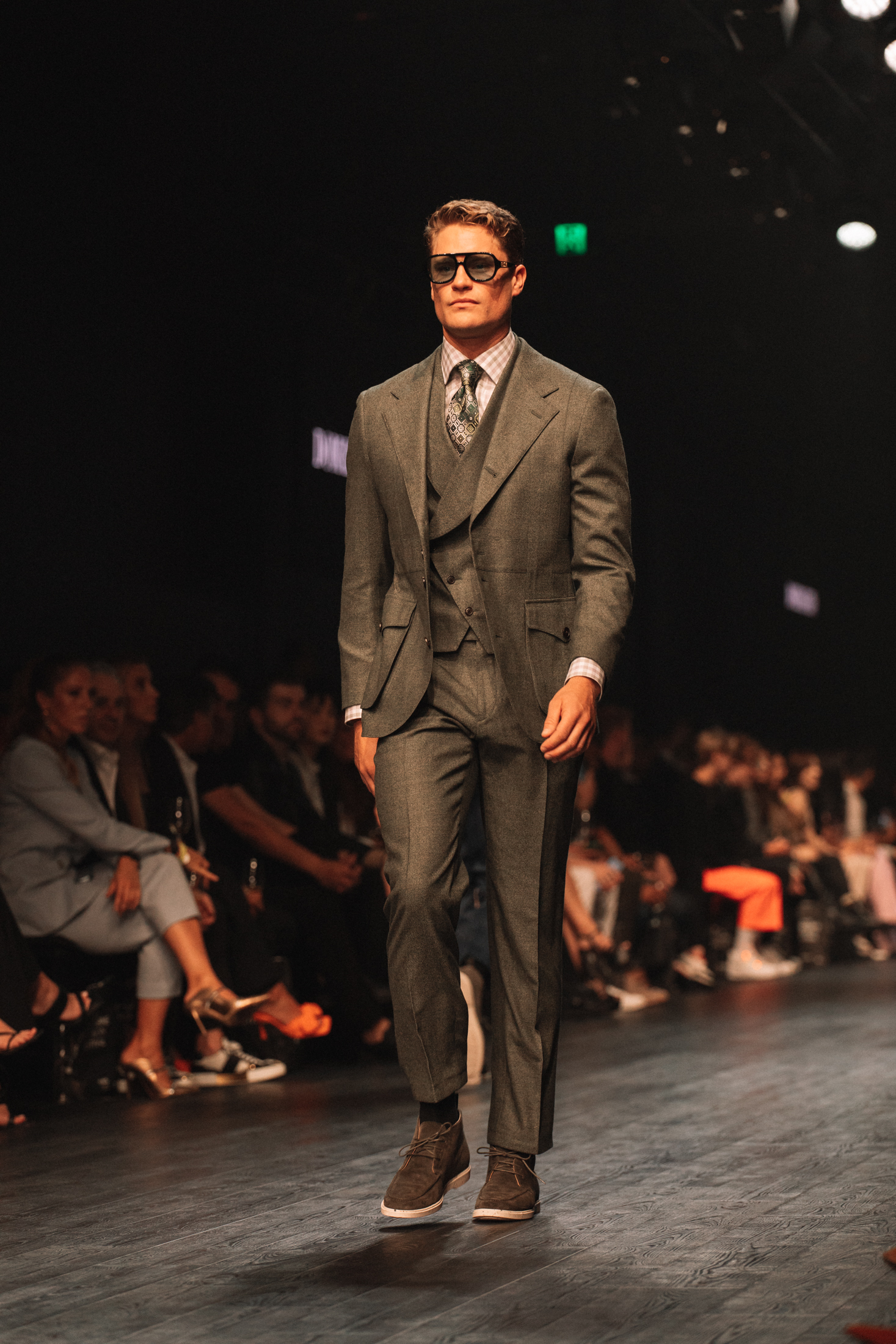 To open, long-time favourite and stalwart of men’s fashion in Australia, Dom Bagnato presented stunning 3-piece suits in hues of dark emerald, rich ochre, light charcoal and deep ivory. Models walked to Stevie Wonder’s ‘Superstition’ in suits tailored to perfection; made from luxurious fabrics such as velvet and wool, with pocket squares, ties and scarves in an array of patterns pulling the sensationally handsome looks together.