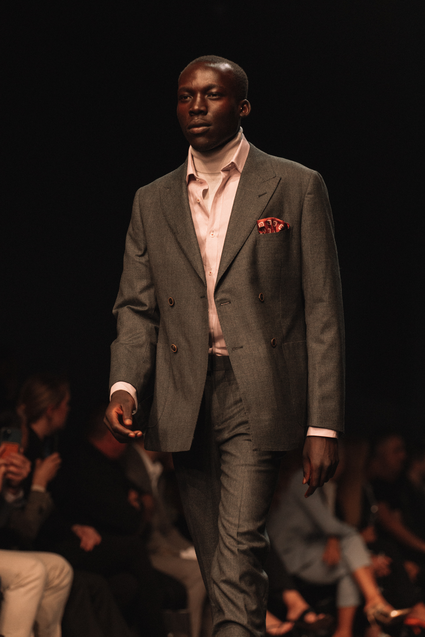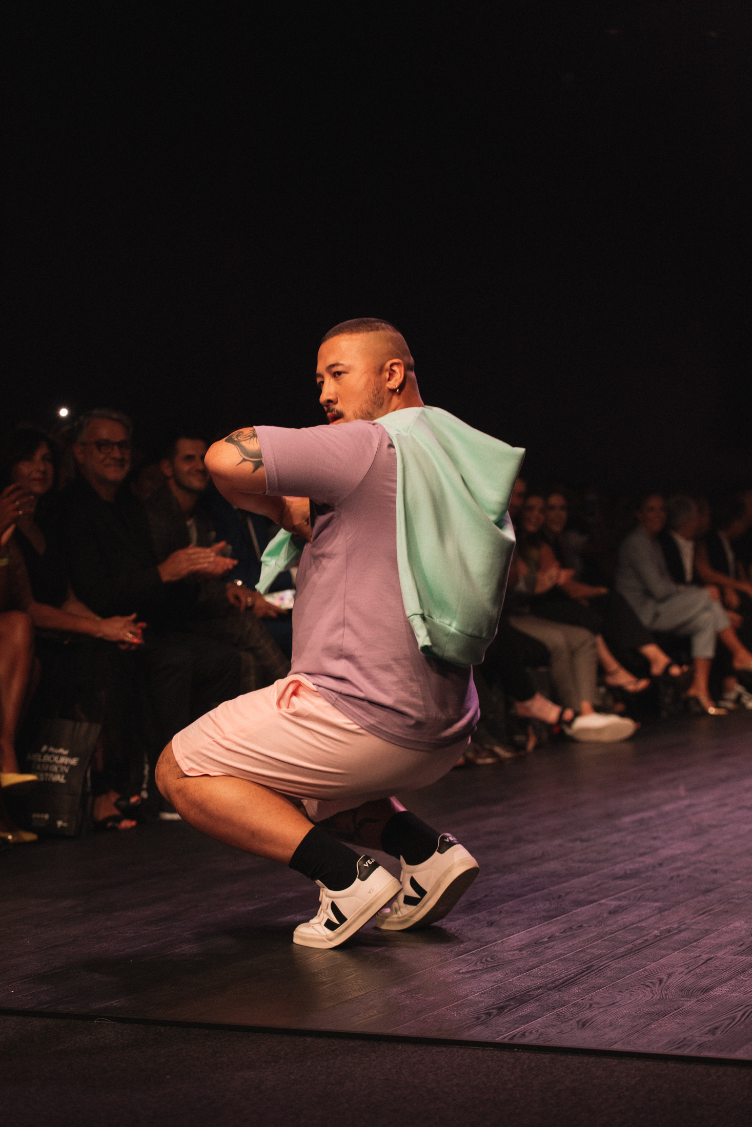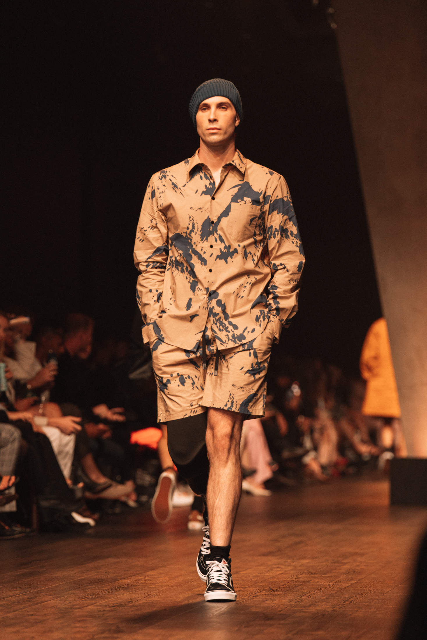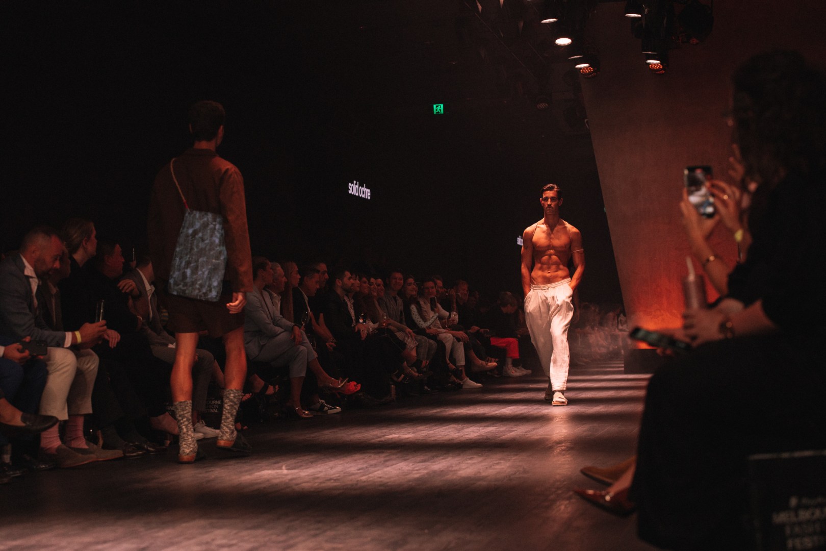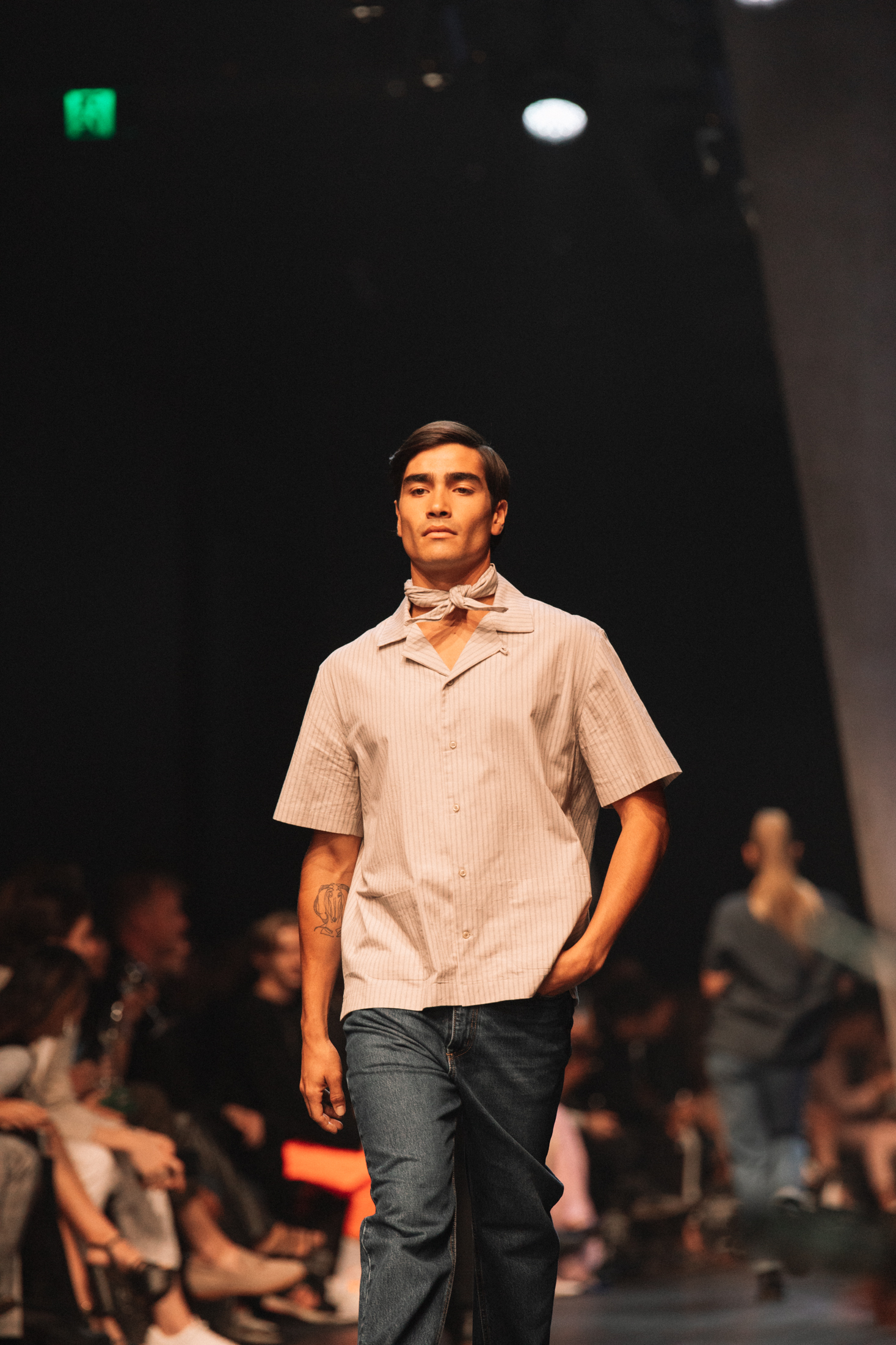 Inspired by culture and connection to Country, Solid Ochre is the fashion label founded and designed by international model, industry leader and First Nations Culture & Safety Consultant for MFF, Nathan McGuire. Featuring an eclectic collection of paired back looks highlighting earthy tones in comfortable cuts. The collection included white linen pants slung low at the hips, shirt and short combos in hues of sienna, charcoal and blue, paired with woollen socks (legit so comfy looking) and suede sandals. Relaxed and stylish, Solid Ochre emanated a refined confidence and understated style that resonated.