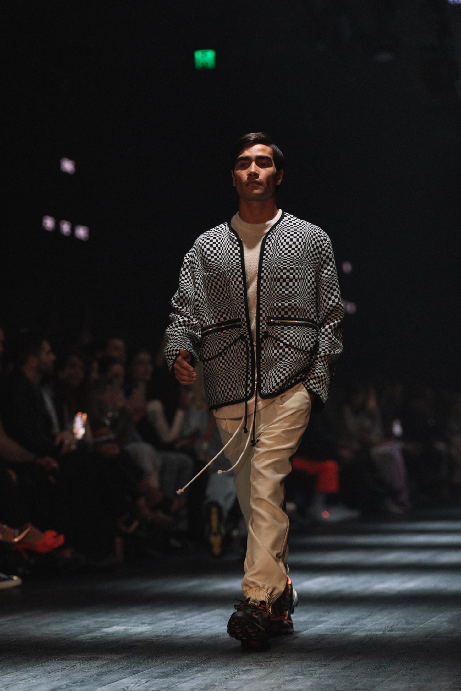 Song For The Mute describes itself as having a ‘male and female cast, with narratives told with beautiful fabrics and experimental process’. Their collection exhibited light and dark, colour and achromatic – an edgy streetwear feel that popped with diamond-patterned jackets, faux leather pants, warped check patterns and embellished splatter coats.