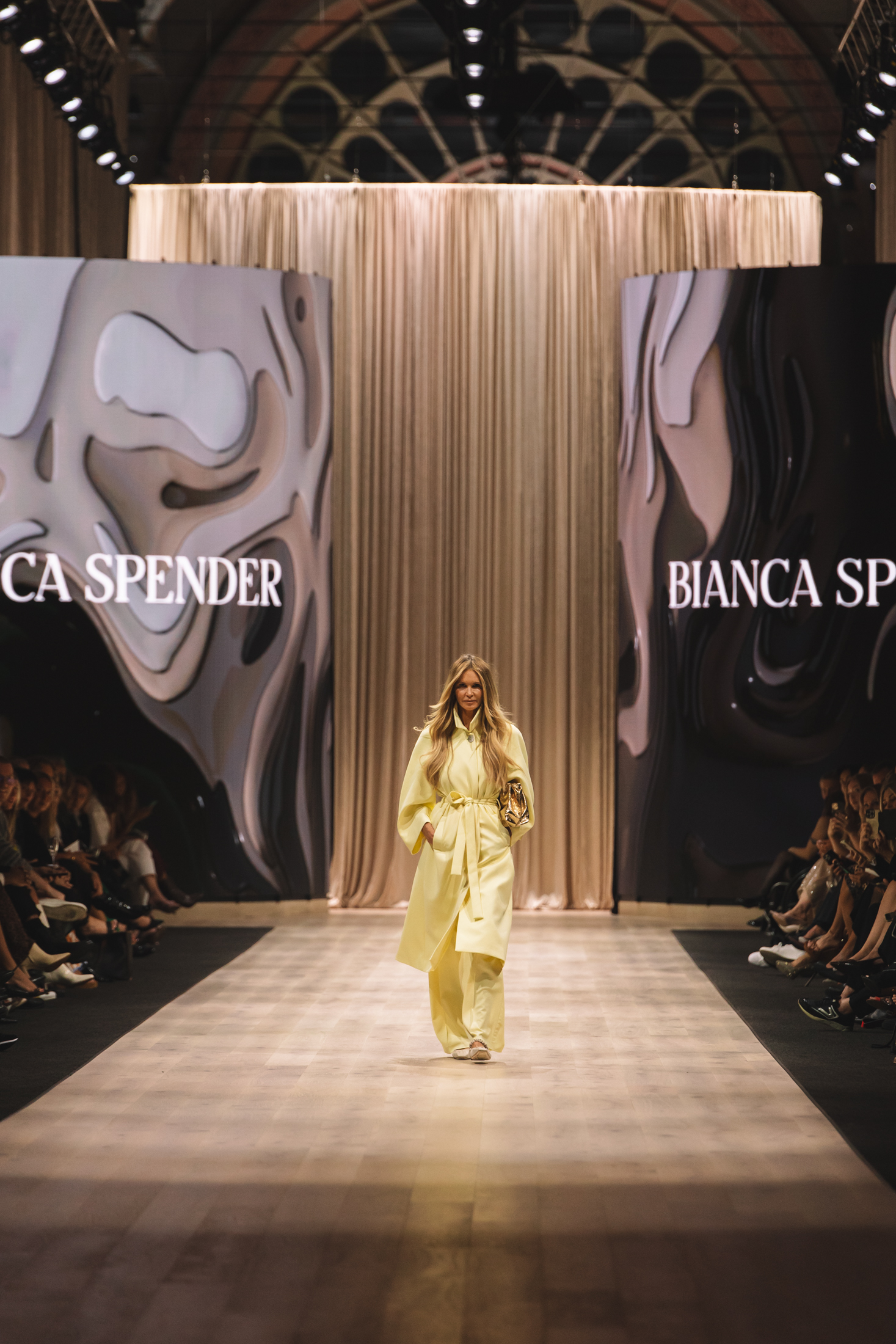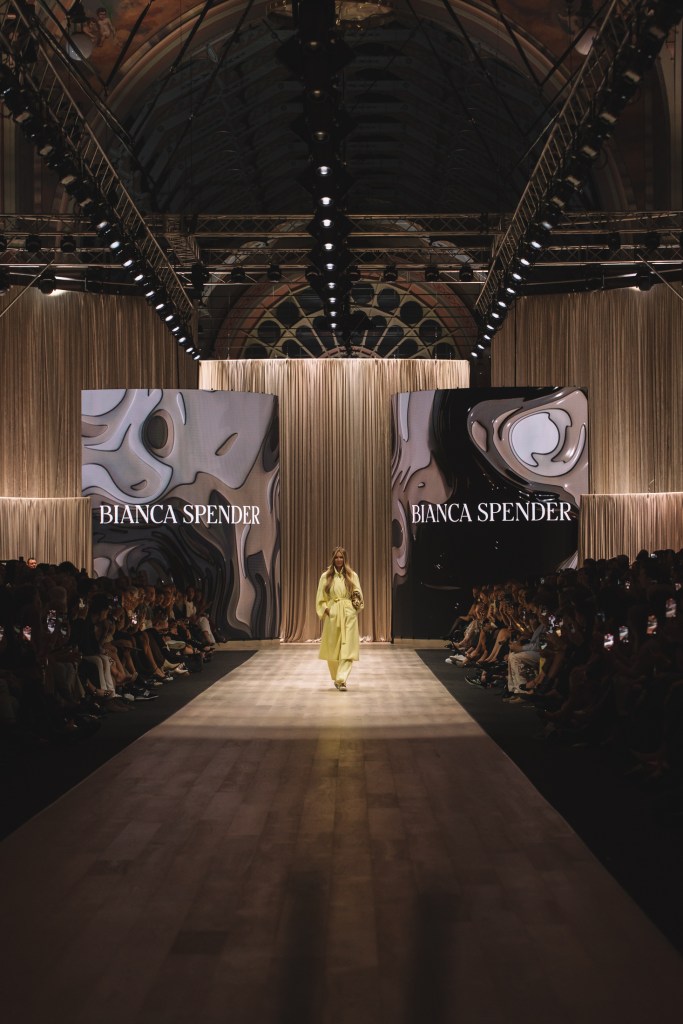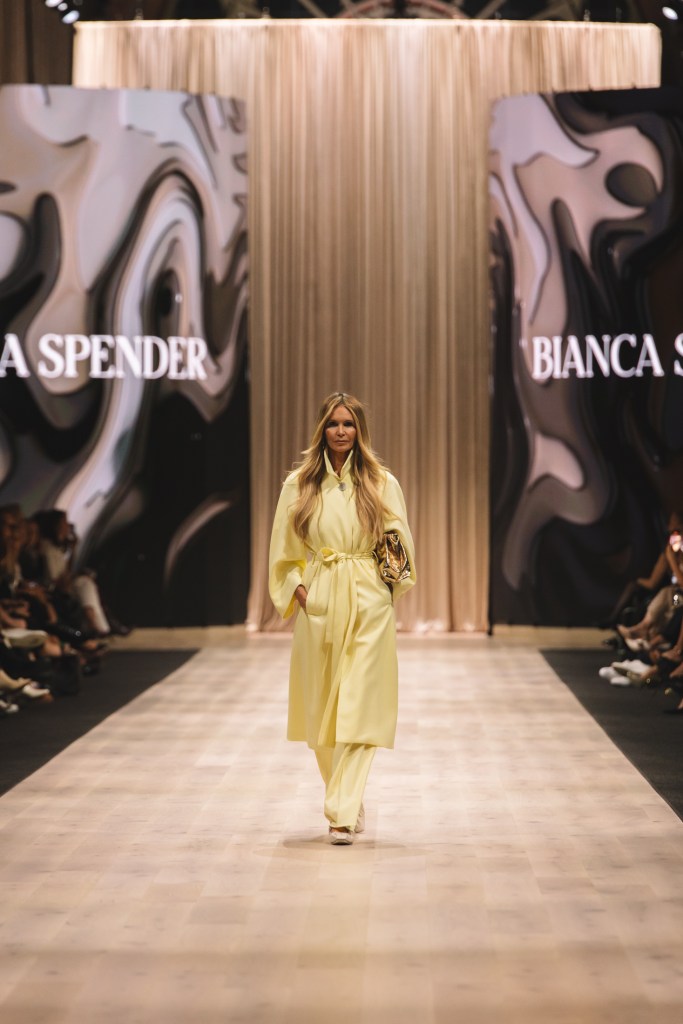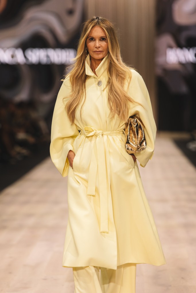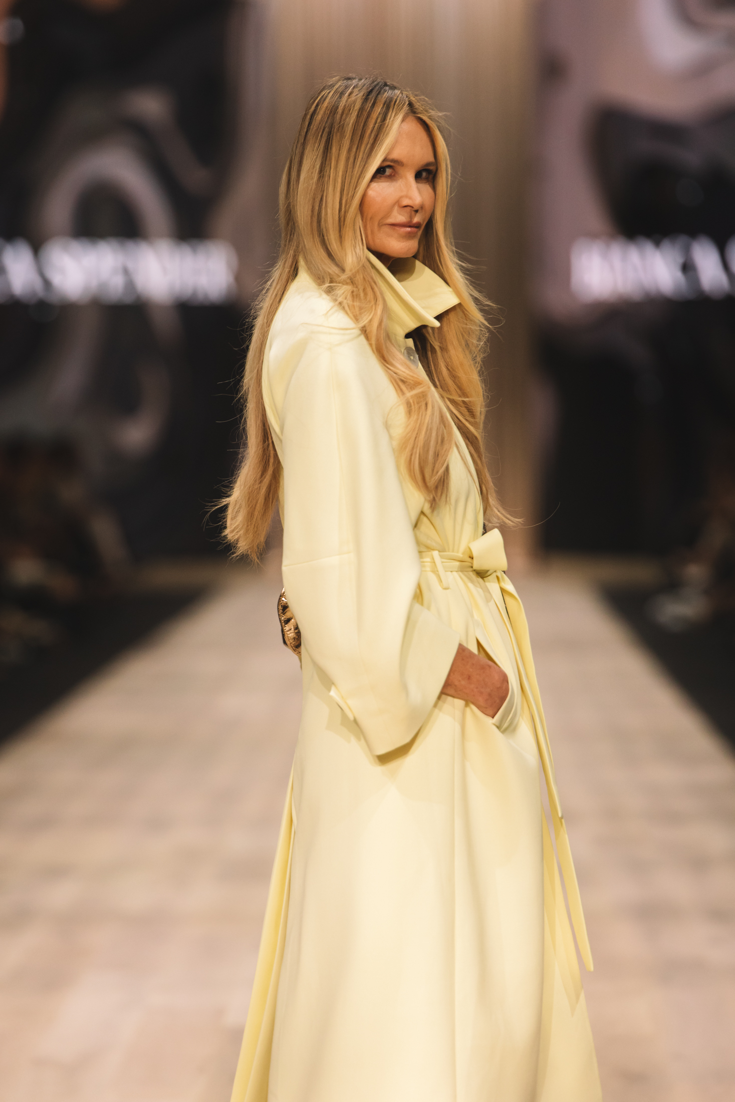 Her second look was a stunning Bianca Spender lemon yellow pant and trench combo, with metallic slouch handbag and her iconic golden locks cascading down. A true standout look for the model coined, ‘The Body’.