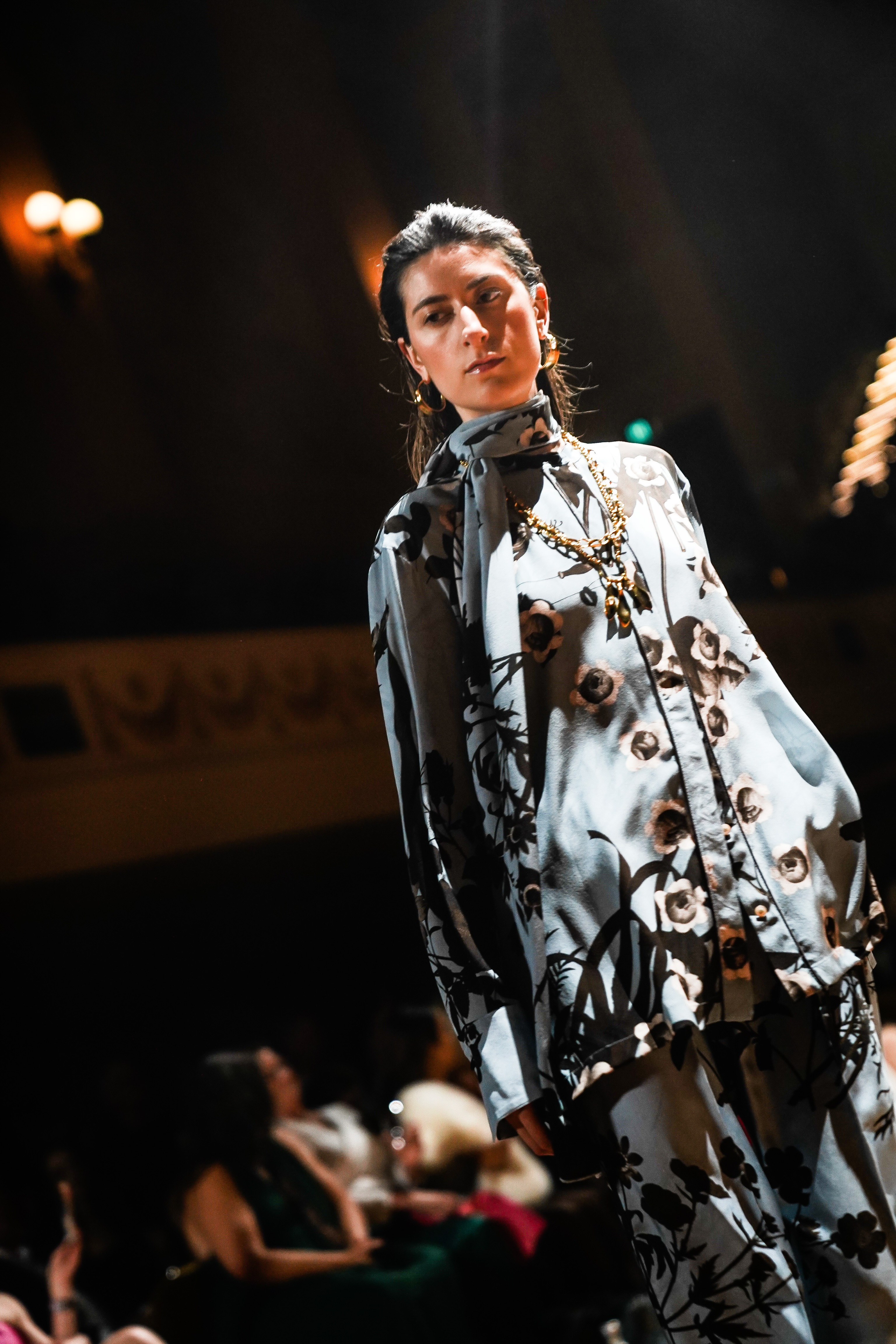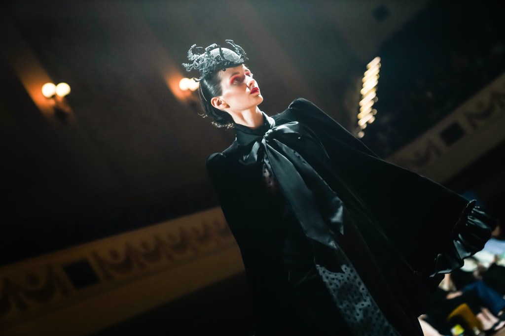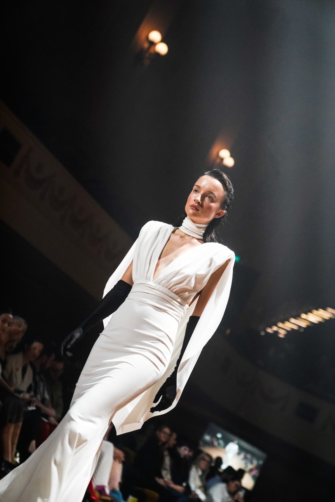 Key runway edits displayed delicate details, structured silhouettes and tailored pieces. Christine on Collins’ collection showcased a stunning array of deep, dark hues with flowing capes that evoked a captivating vampiric elegance. Each piece was designed to exude a sense of mystery and drama; perfectly embodying the dark romance of the theme.
