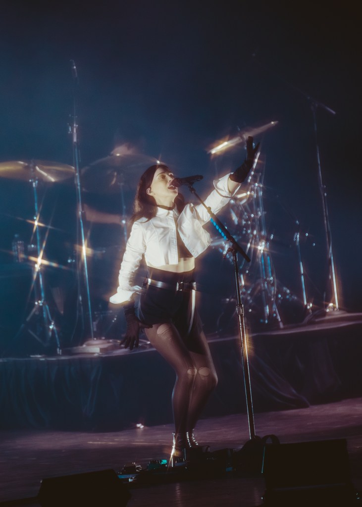A radiant beam of light pierced the audience, casting an ethereal glow as the infectious beats of the first song of the night, ‘Reckless’, filled the air. “I breathe you out, breathless, breathless, breathless.” St Vincent sang these lyrics and they immersed the crowd; each word enveloping them in a theatrical embrace. It was a powerful moment that seemed to embody the name of the tour, All Born Screaming, as if we were all experiencing a rebirth together at that very instant. Blinded by the light at first, but as its brilliance gradually dimmed, it was then that St. Vincent emerged, their presence at once electrifying. Wearing a cropped white t-shirt, paired with stylish shorts and a sleek belt, with edgy boots completing the ensemble, St. Vincent’s look was the ultimate embodiment of the glam rock aesthetic infused with her trademark sophistication.